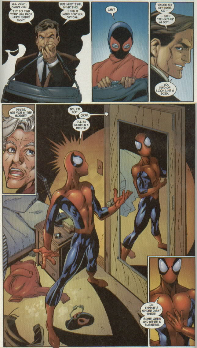 Now, as you can see, in Ultimate Spider-Man, the only things the outfit was missing when it was handed off were its webs and spider symbol, which, if we’re being really honest with ourselves, we realize is ridiculously convenient. Sure, it’s specially made, but do you even know of a specialty costume designer that can make those perfect, sock-slipper red booties? Okay, maybe you do, but, do you know of any wrestling organization that’s going to order boots like those instead of the traditional laces-to-the-knees wrestling boots? Seriously. Spider-Man’s boots don’t exist in the real world–the only idea more ludicrous than the thought that his stingy, freelance employer shelled out a ton of money to have an extremely creative outfit custom-made for Peter Parker is the idea that Tobey Maguire made his movie duds all by his lonesome. I mean… sure, why wouldn’t a dude with spider powers be good at knitting/sewing/weaving/whatever, but the idea that Peter Parker was given a wrestling outfit that actually looks like a wrestling outfit just makes sense.