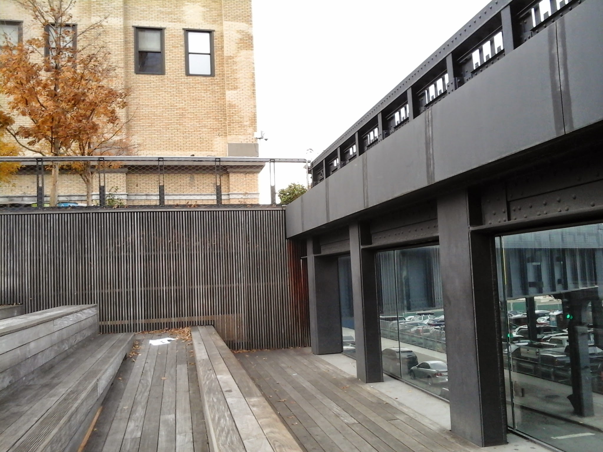 But then the rain started. I don’t want to make that sound like a disaster because it did not kill the session. It did mean I had to migrate south on the High Line until I reached an underpass where vendors are usually set up. There are two levels on that underpass, and near the southern end of the bottom level, there’s this ridiculous, scenic seating area that would have been amazing.