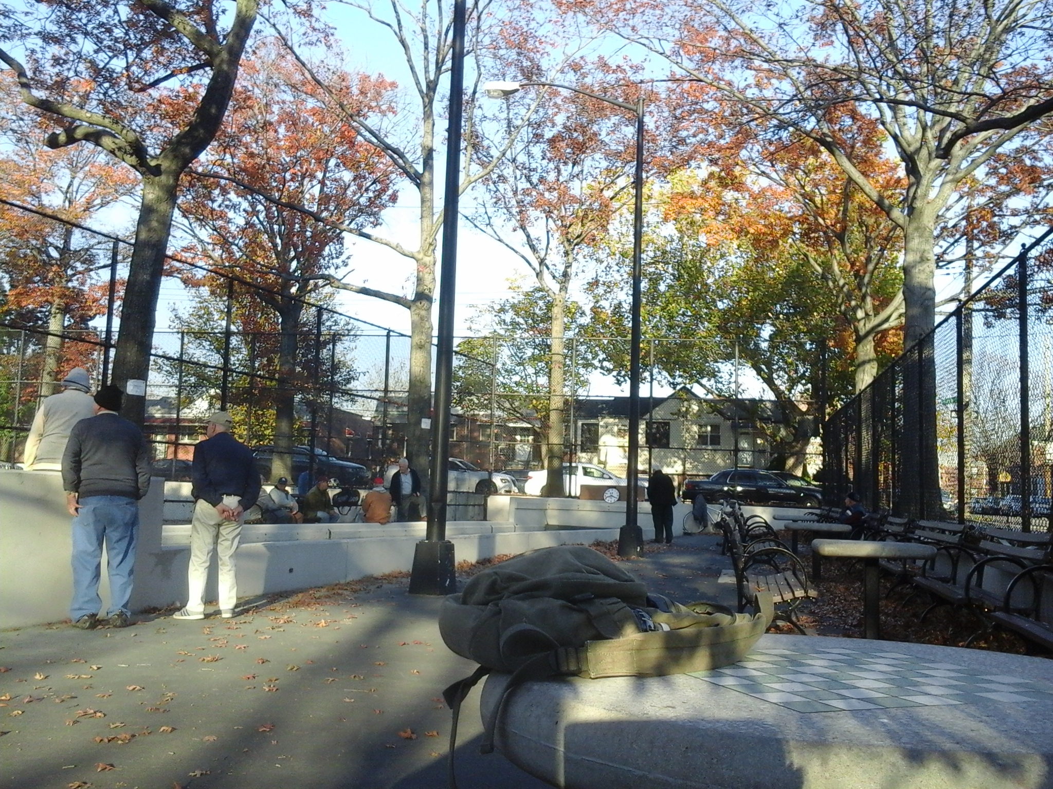 Thus, the choice of my writing location, Loreto Playground. It immediately sounds like a much weirder choice of writing spot than it is; I was not sitting in a playground meant just for kids, stupidly trying to ignore all of them screaming and (in my imagination) throwing things at each other and hitting me instead–constantly. No, Loreto is actually a park here in the Bronx, small and sequestered in the Van Nest area. In my youth, I walked by this park a ton on my way to a nearby Blockbuster (dating myself). It wasn’t until recently that I actually sat down here, in a part of the park with a large ski ball track (I… think?) and chess/checker tables where I’ve only ever seen seniors.