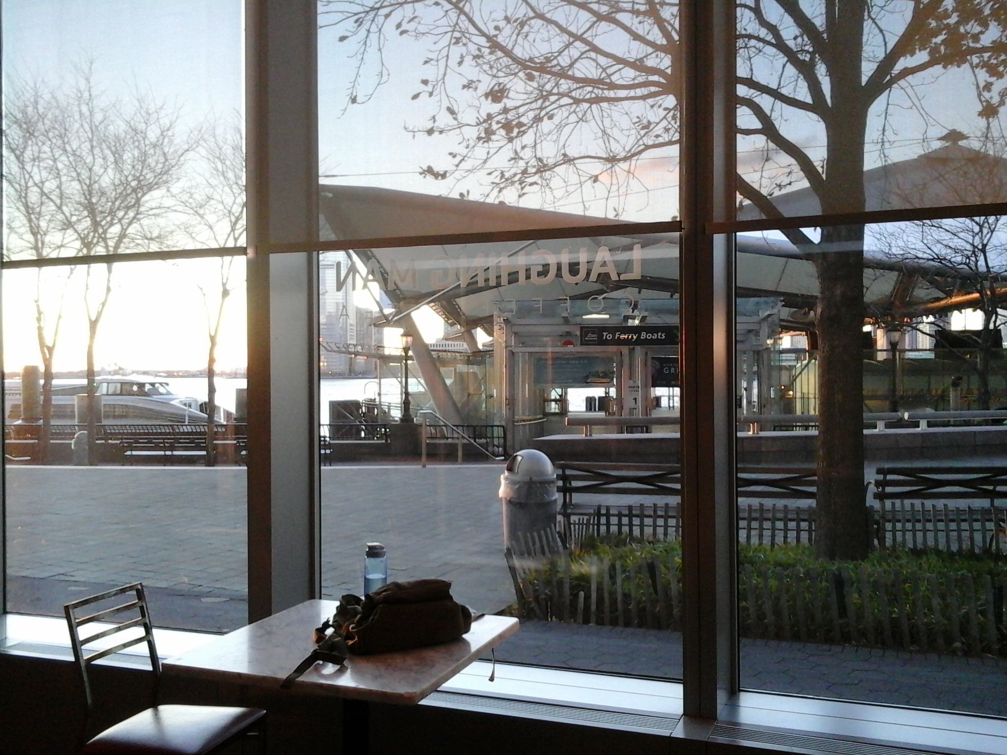 Walking west eventually led me to a small public lounge looking over the ferry port at the end of Vesey St. There’s a fantastic chance this place has a name (very likely, it’s part of Brookfield Place), but all I really cared about was nabbing my picture, grabbing a seat, and getting to work.