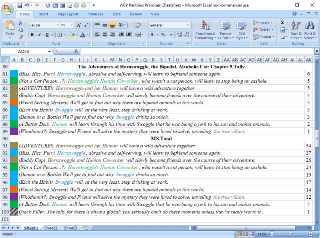 And the tally makes that effort practical for me as a writer. The goal of this run was, as mentioned, to manage my arcs, which I’ve tied to promises—at least for this novel. A tally of ‘promises advanced’ by the end of each chapter makes it unavoidably clear how much I’ve advanced each promise and arc per chapter. And an additional “MS Total” tally makes it clear what progress I’ve made with them in the outline overall.
